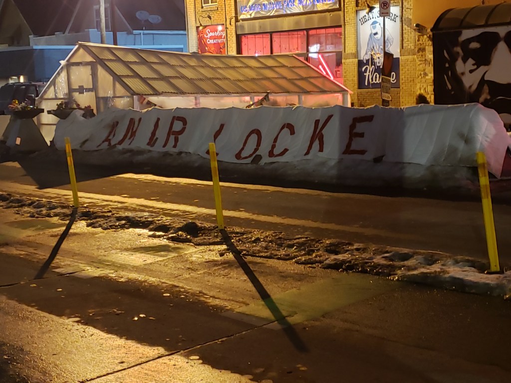 Across the street was the source of the fire – some young folks were holding their daily vigil. I stopped to visit, introduced myself and they returned the favor. I asked what they do while there and one man replied, “We just check in with each other, go over the events of the day. Stuff like that.” It seems a small surrogate family was formed in this small group. They asked me why I was there, so I briefly explained my relationship with Floyd – as his recent friend and that he confided in me as a pastor.